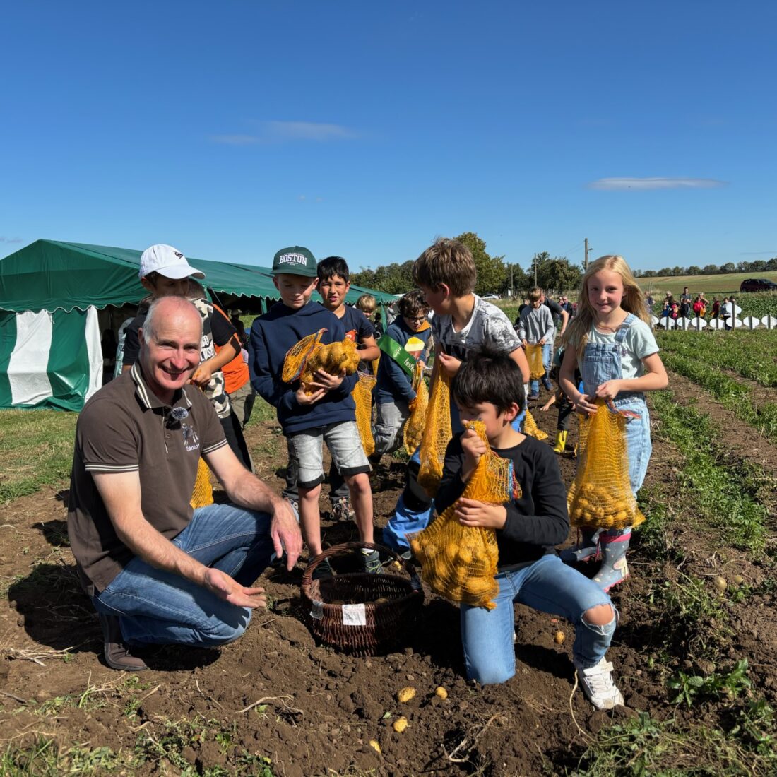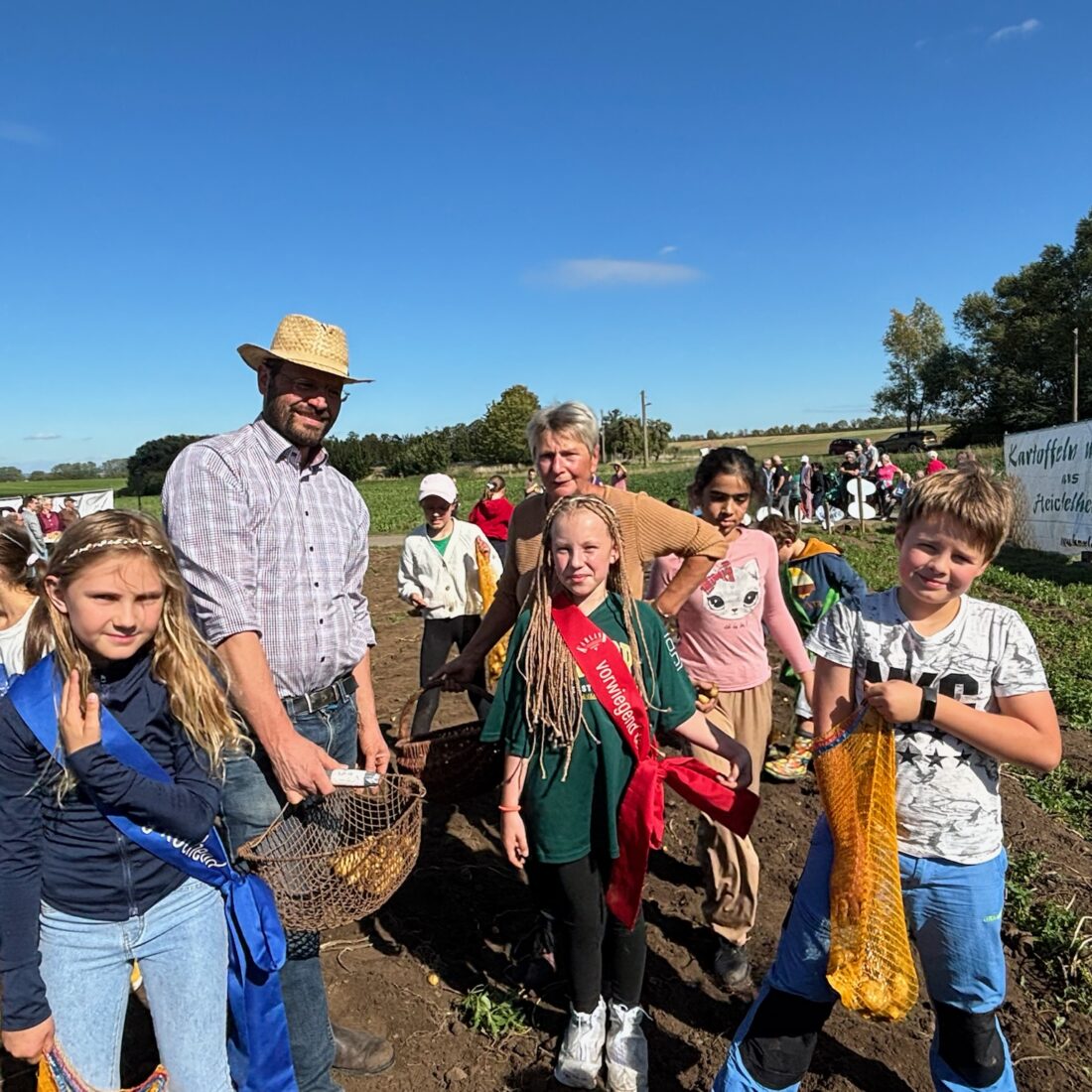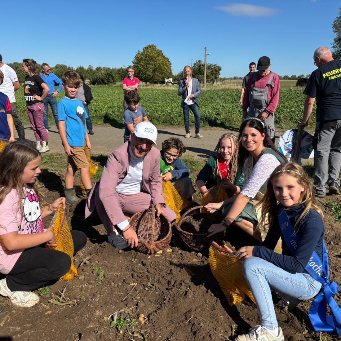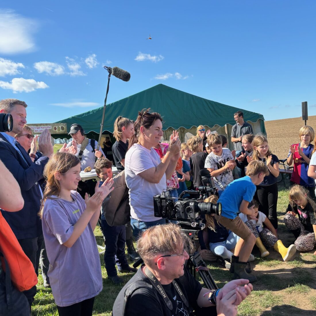 Auf dem Acker in Heichelheim herrschte reger Betrieb am 18.9.2025: 80 Kinder aus der Pestalozzi-Grundschule Weimar und der Kita Heichelheim halfen bei der diesjährigen Kartoffelernte – begleitet von zahlreichen prominenten Unterstützerinnen und Unterstützern aus Politik, Medien, Kultur, Landwirtschaft und Wirtschaft.