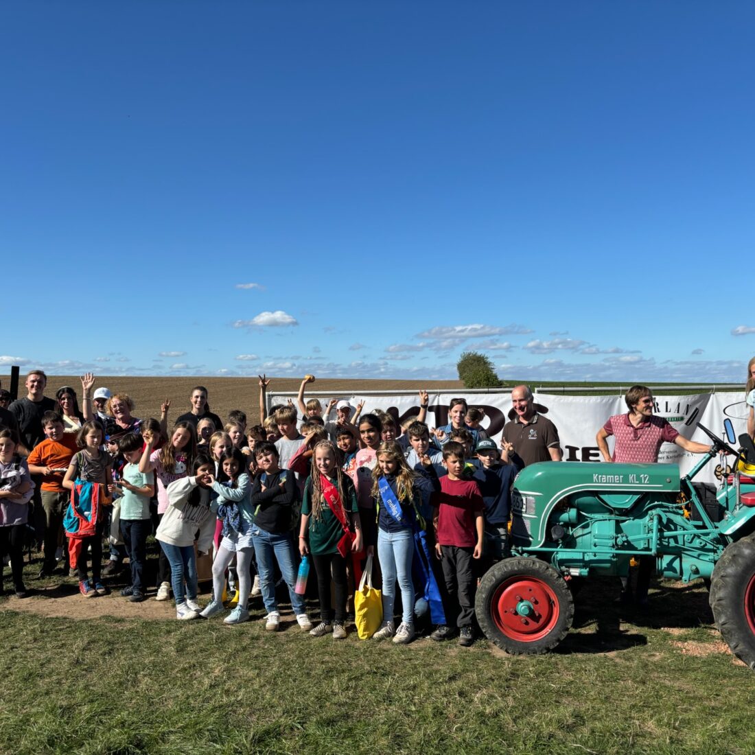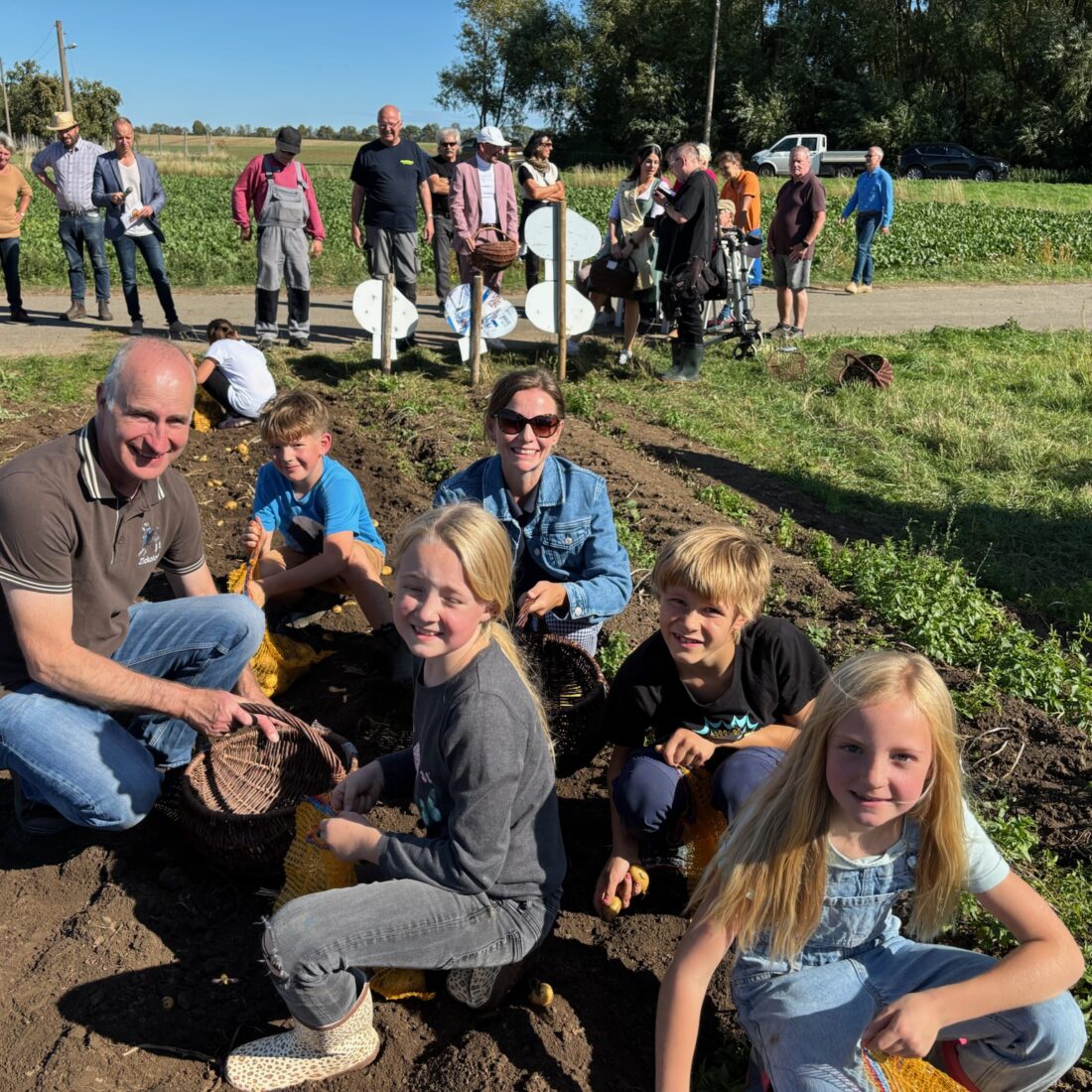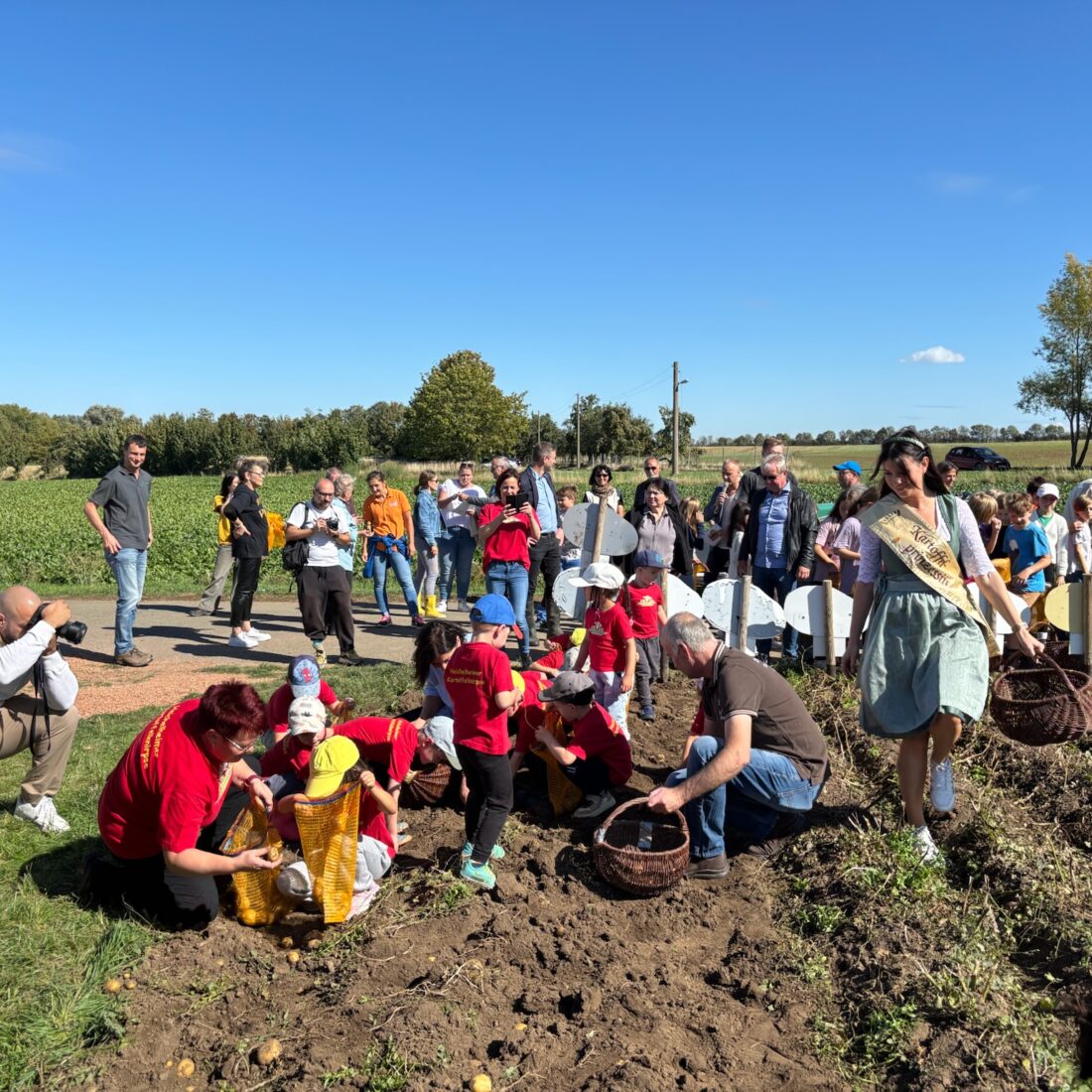 Auf dem Acker in Heichelheim herrschte reger Betrieb am 18.9.2025: 80 Kinder aus der Pestalozzi-Grundschule Weimar und der Kita Heichelheim halfen bei der diesjährigen Kartoffelernte – begleitet von zahlreichen prominenten Unterstützerinnen und Unterstützern aus Politik, Medien, Kultur, Landwirtschaft und Wirtschaft.